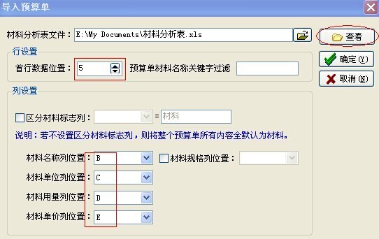 3. 在材料預算單導入設置窗口中設置導入參數如下:
