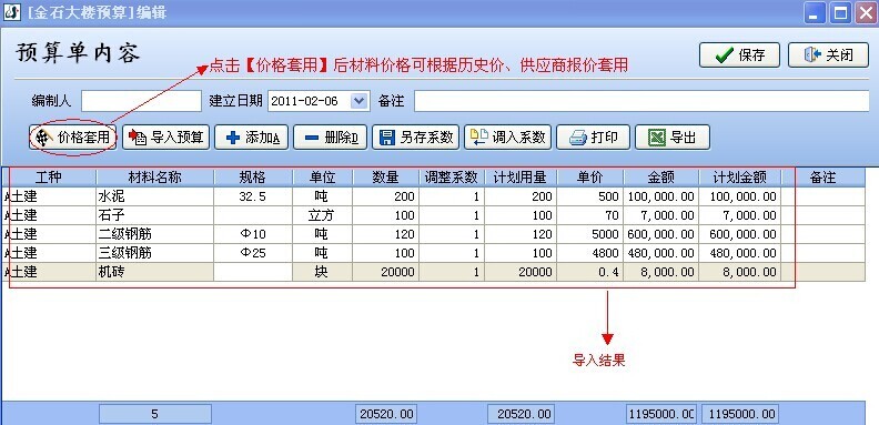 2. 在材料預算單內容編輯窗口中,采用【導入預算】的功能方式。