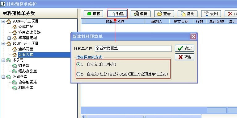 1. 打開【材料管理】模塊中【材料預算單】,選中項目后點擊【新建】按鈕創建材料預算單。