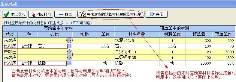 導入完的生成結果,(由于預算軟件中生成的材料分析表里的材料名稱與實際發生的材料名稱有些差異,這里需要用戶將未對應的材料做下手工匹配)