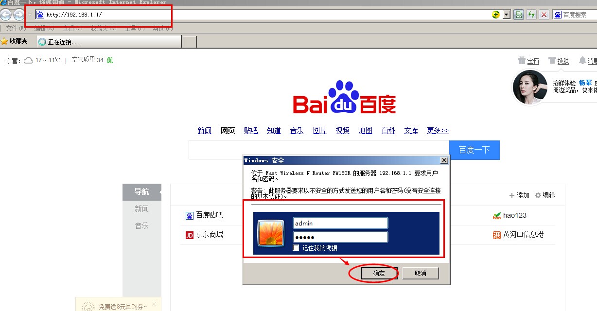 打開瀏覽器,在瀏覽器地址欄輸入路由器登錄地址,示例路由器登錄地址為192.168.1.1回車,彈出路由器登錄賬號和密碼窗口,輸入路由器的賬號密碼,點擊確定。