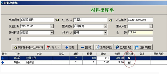 2. 【材料出庫單】在材料庫存單填寫的時候,在明細中選擇甲供,則該材料會進入項目甲供成本。