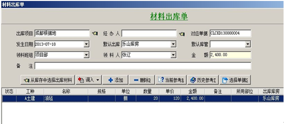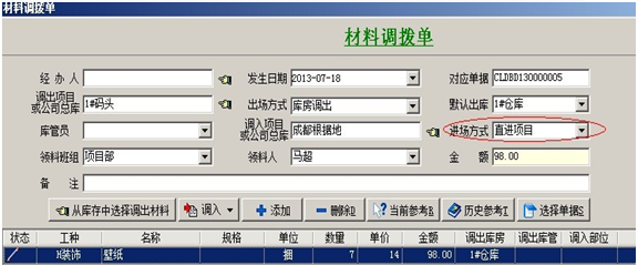3. 【材料調撥單】主要用于:項目與項目之間的材料調撥,或公司總庫與項目之間的材料調撥。在填寫時要選擇好調出項目和調入項目。調出項目有兩種出場方式:庫房調出和班組繳料,調入項目有兩種進場方式:調撥入庫和直進項目。進場方式選擇直進項目時,明細中的材料金額會進入調入項目的成本中。如果調出項目,出場方式選擇的是班組繳料,也就是從項目現場直接調出的,這時調出項目的成本中會減去明細中材料的金額。