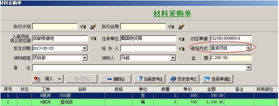 2. 【材料采購單】也稱為:材料驗收單、材料入庫單,是材料采購時,材料到達現場后要填寫的單據。在單據填寫時進場方式分為:采購入庫和直進項目。與其他入庫單相同,進場方式選擇直進項目時,明細中的材料金額會直接進入單據所選的項目成本中。