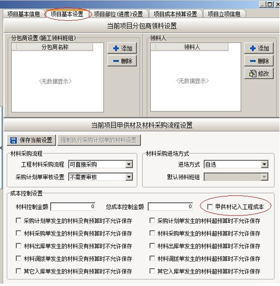 (二)、甲供材料,是項目所用材料由甲方公司提供。在默認情況下甲供材不會統計入項目成本,如果用戶希望甲供材統計入項目成本,必須在項目維護中把相關開關打開,如下圖: