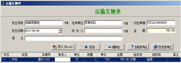 2. 【運(yùn)輸車(chē)輛成本】一般用于統(tǒng)計(jì)公司租賃車(chē)輛周轉(zhuǎn)材料所產(chǎn)生的成本,成本根據(jù)運(yùn)輸車(chē)輛單來(lái)統(tǒng)計(jì)。