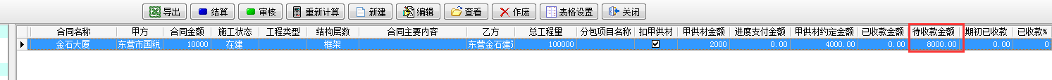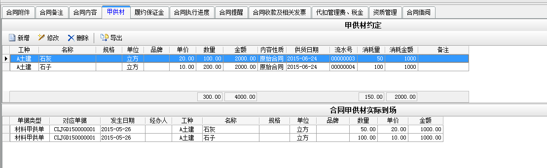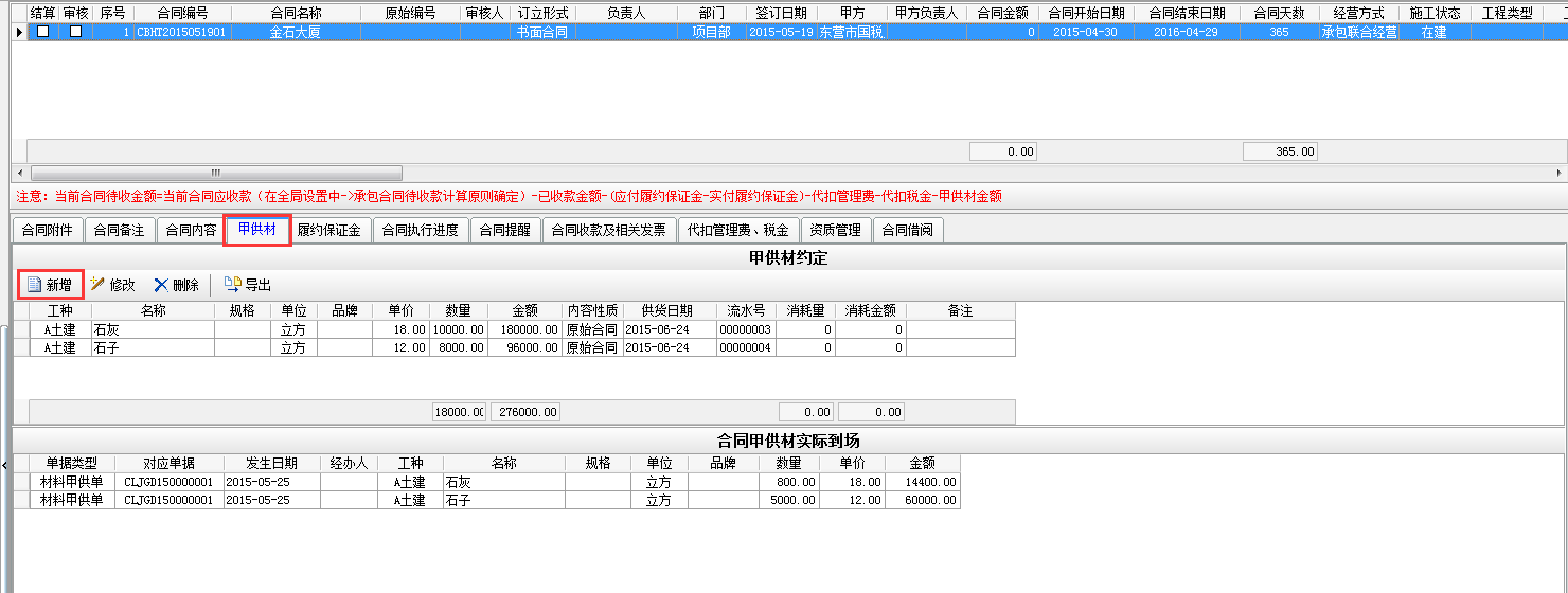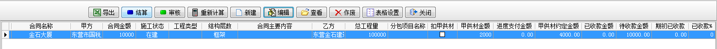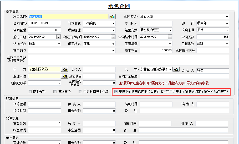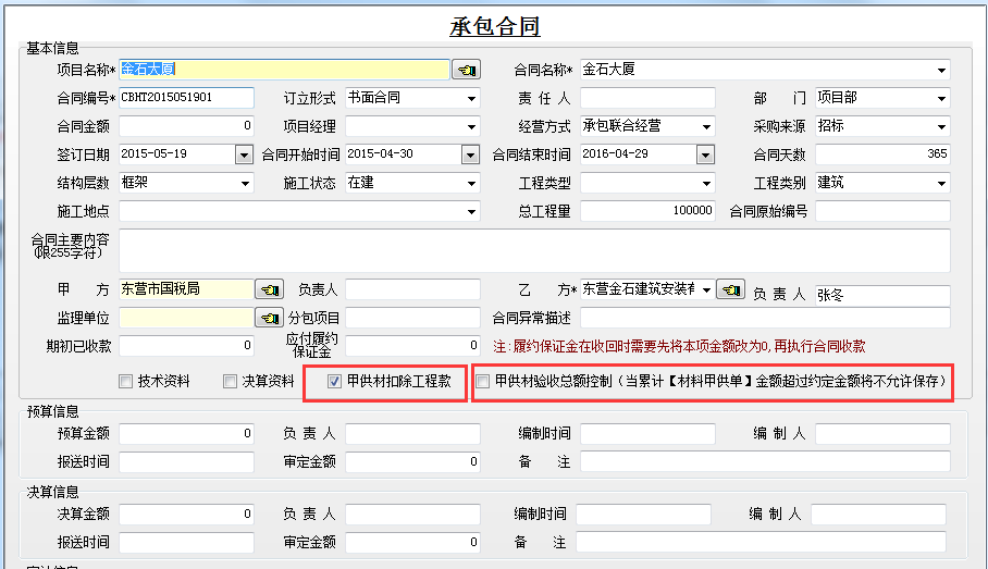 例如我們做一個合同金額為10000的承包合同,其中在工程甲供材料管理中甲供材約定金額為4000。如下圖