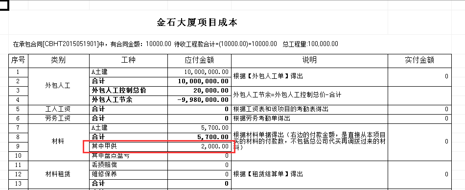 當(dāng)不勾選上甲供材計入工程成本時,甲供材這顯示為0。如下圖: