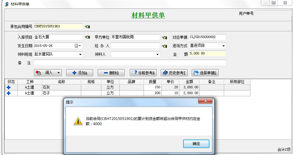 勾選好之后當(dāng)累計材料甲供單金額超過甲供材料約定金額時,則不能保存。如下圖: