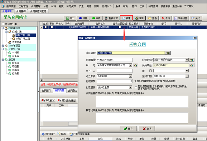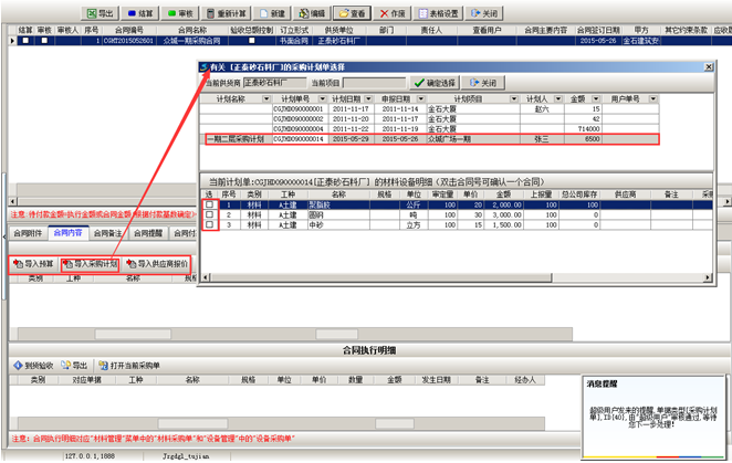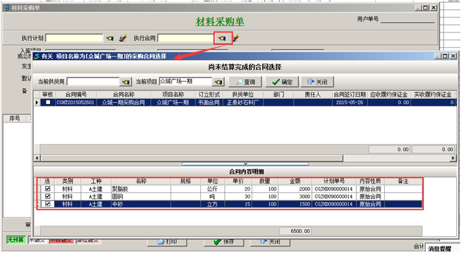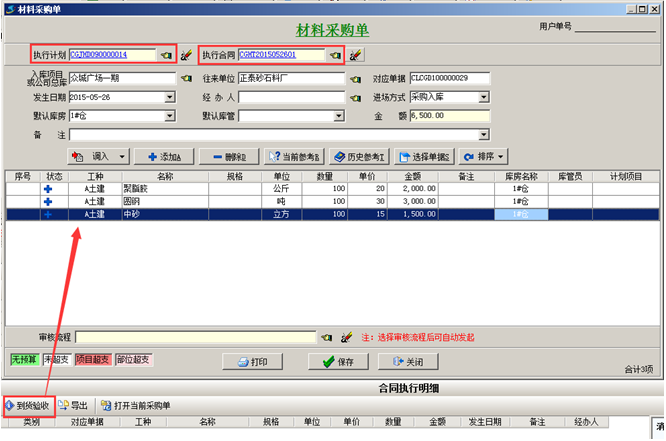 第四步,材料到貨之后,可在【材料管理】模塊,做“材料采購單”,選擇材料的時候,選擇“執行合同”,在合同明細里面添加到貨內容。如圖:
