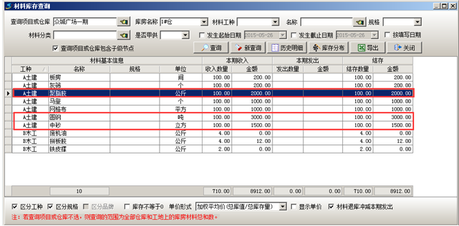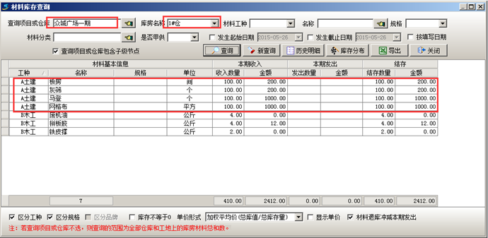執行完成工程項目材料采購流程之后可在對應的倉庫中查詢到對應的材料庫存,如圖: