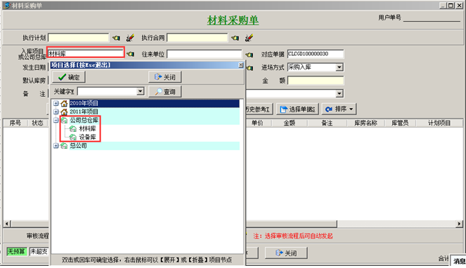 注:如果工程項目材料采購流程規定材料是入到項目的倉庫中則選擇對應的項目上的倉庫,如果采購回來的材料是入到公司總庫,則選擇“入庫項目”為“公司總倉庫”,如圖: