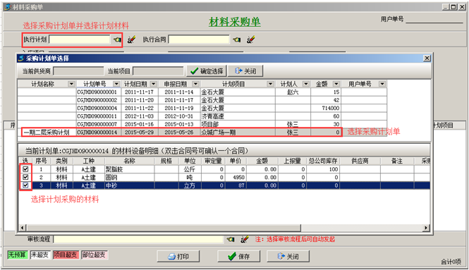 “采購計劃單”添加完成,則添加“采購入庫單”進行采購入庫,采購入庫。在添加“材料采購單”基礎信息時,選擇“采購計劃單”,并調入計劃單中的材料。如圖: