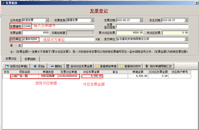 如果有發票,則進入“發票管理”進行發票登記,選擇“業務類型”(“收進發票”或“支出發票”),選擇“發票類別”,輸入“發票編號”,“發票金額”等基本信息,如圖: