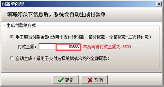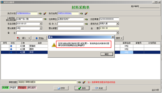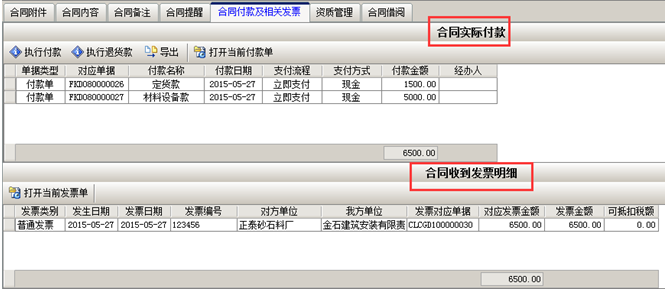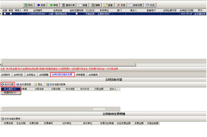 材料入庫完成之后,點擊“合同付款及相關發票”,點擊“執行付款”(付材料款),輸入付款金額。如圖: