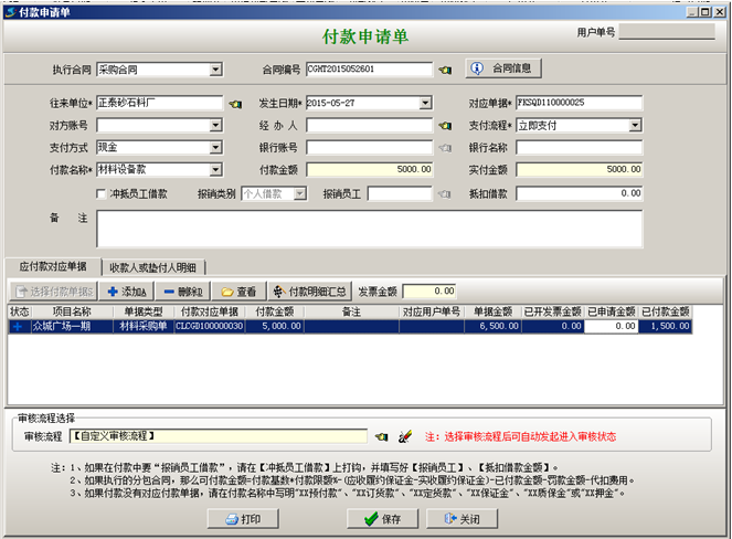 在工地現場材料管理過程中,如果工地現場采購大量材料需要簽訂采購合同并在到貨之前付預付款時,我們要在采購合同中,選中對應的采購合同,點擊[合同付款及相關發票],點擊[執行付款]-[手工填寫]彈出“付款申請單”,在“付款申請單”中選擇執行“采購合同”,并選擇對應的“合同編號”,選擇“支付方式”,選擇“付款名稱”為“訂貨款”,并在“付款金額”里面輸入“預付款”金額,“付款申請單”添加完成之后點擊[保存]的按鈕保存單據,如圖: