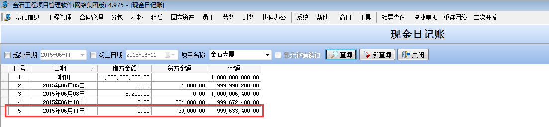 然后我們工地項(xiàng)目管理系統(tǒng)中查詢一下現(xiàn)金流水賬,如下圖