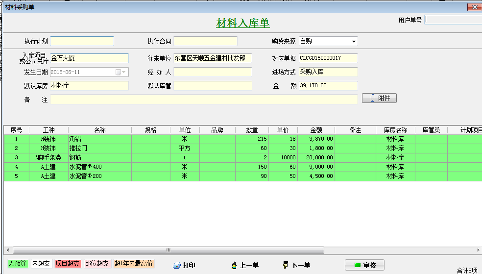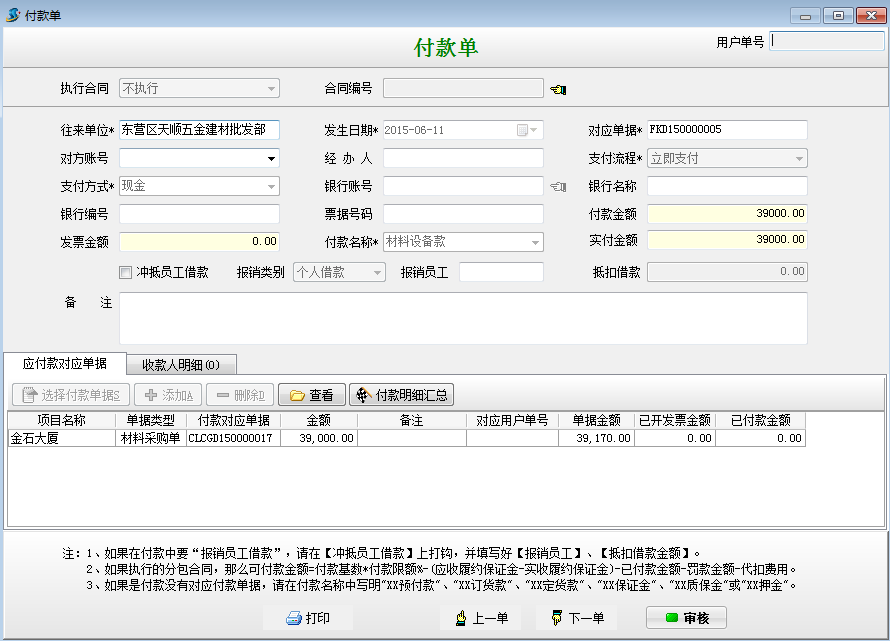 做一個(gè)總價(jià)金額39170材料采購單,優(yōu)惠金額為170,實(shí)際付款金額為39000。如下圖