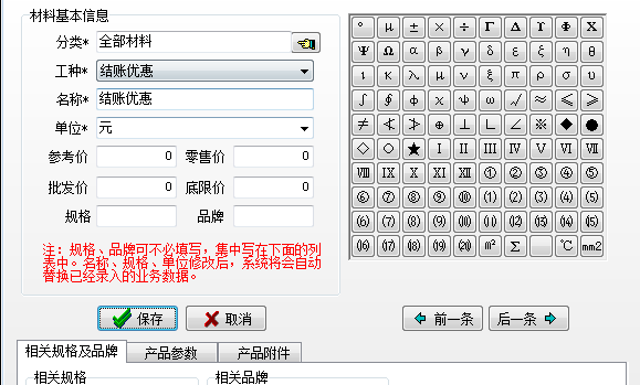 首先在工地項(xiàng)目管理系統(tǒng)中材料維護(hù)新建一個(gè)名稱為結(jié)賬優(yōu)惠的虛擬材料,如下圖:
