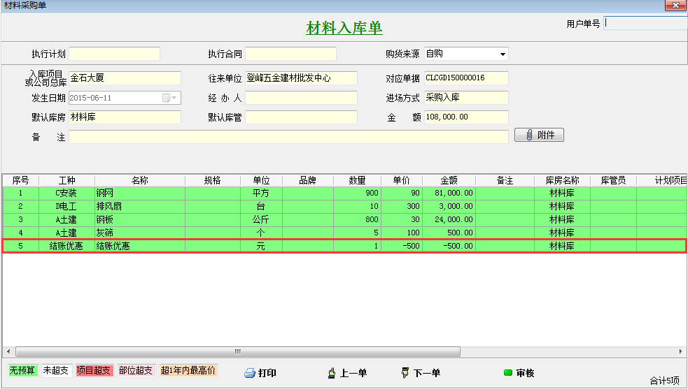 如果有優(yōu)惠金額時(shí),在工地項(xiàng)目管理系統(tǒng)中填寫采購入庫單時(shí)添加這個(gè)結(jié)賬優(yōu)惠的虛擬材料,金額為優(yōu)惠金額的負(fù)數(shù)
