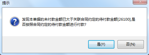 我們填寫的付款控制比例為20%,當(dāng)付款數(shù)超過付款比例限制時,系統(tǒng)提醒。如下圖