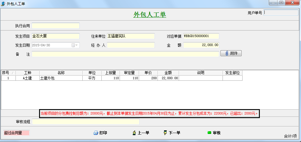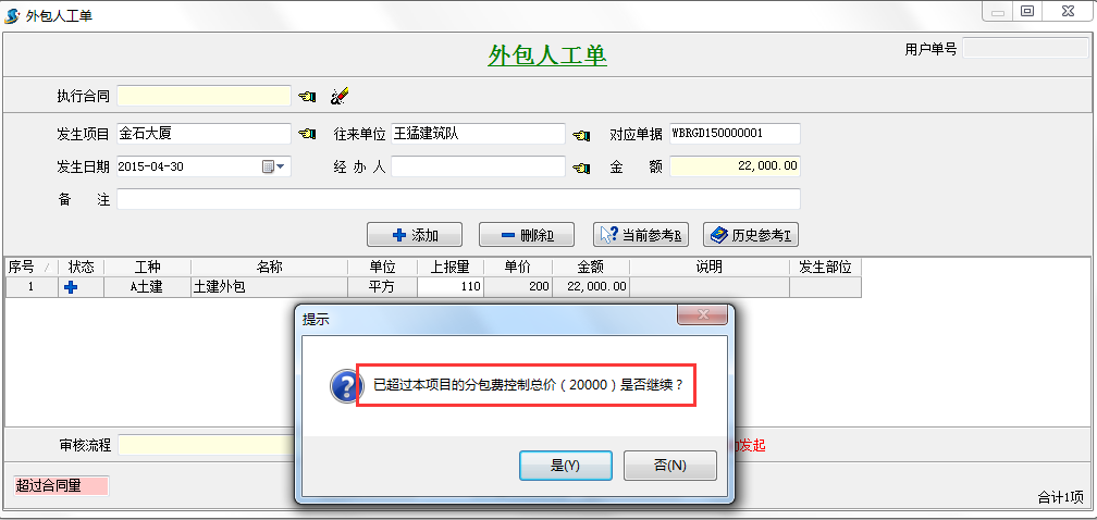 填入成本控制金額,當(dāng)超過該金額時,系統(tǒng)會自動提示。假如我們成本控制金額填入20000,我們在新錄入外包人工單時會自動提示。