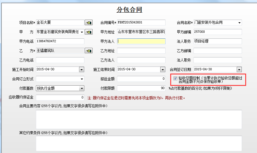 即通過分包合同驗收總額控制選項來控制驗收總額。