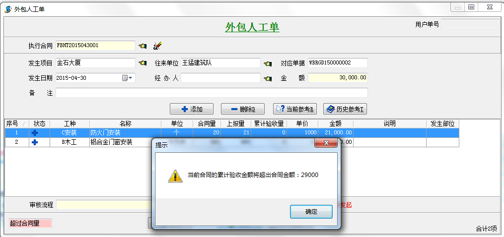 當(dāng)我們驗收超過總額時系統(tǒng)會自動提示,并且外包人工單不能保存。