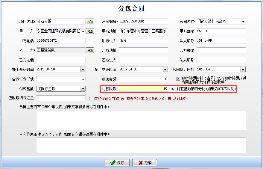 即在新建分包合同時填寫好付款限額。如下圖: