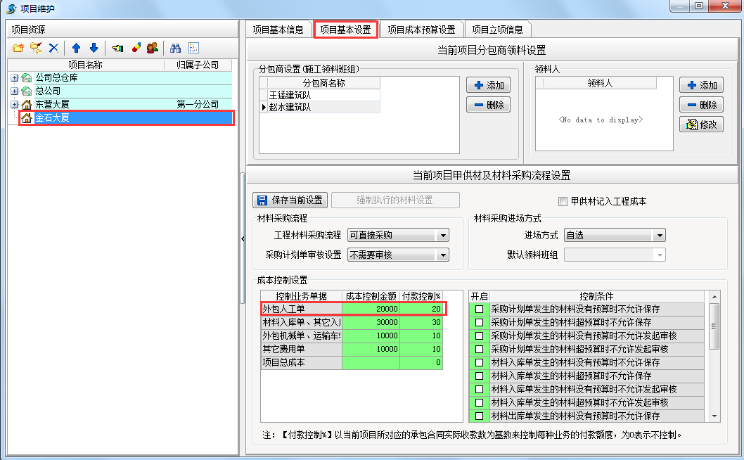 在新建項目時設(shè)置成本控制金額和付款控制比例。具體設(shè)置方法【工程管理】模塊?【項目維護(hù)】項目