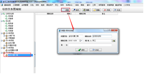進入系統的“項目管理”模塊,點擊“項目任務圖編制”,點擊“新建”按鈕保存,(便于后期進行工程項目施工進度的管理)如圖: