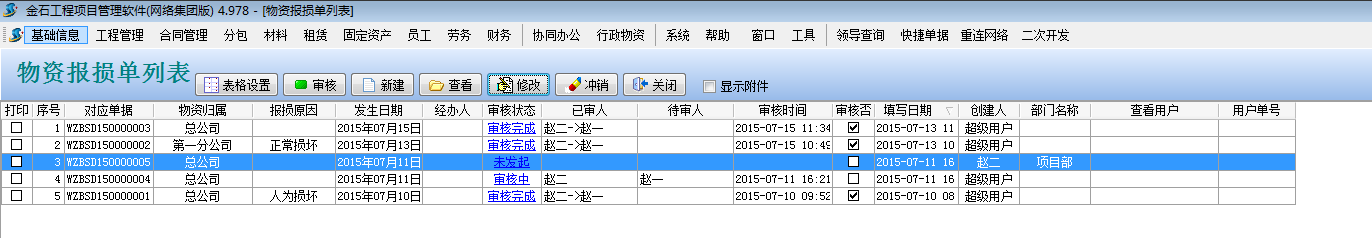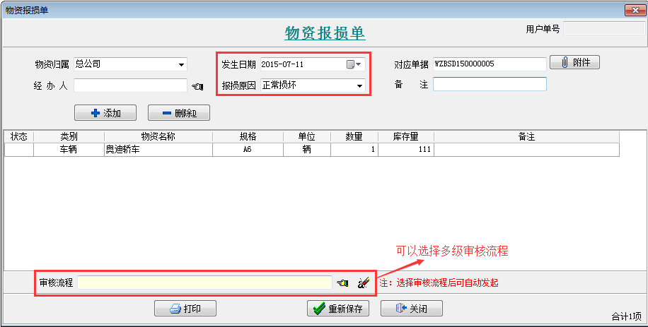 【物資報損單】是用來報損物資的業務單據。 類似【材料報損單】或者【設備報損單】,一個是針對物資報損,一個是針對材料或者設備報損。