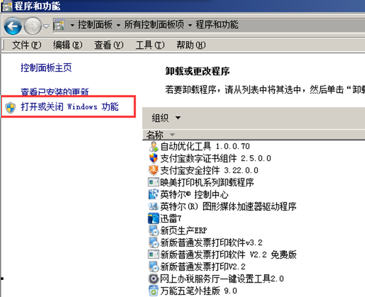第二步,在“程序和功能”中點擊“打開或關閉程序”,如圖: