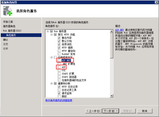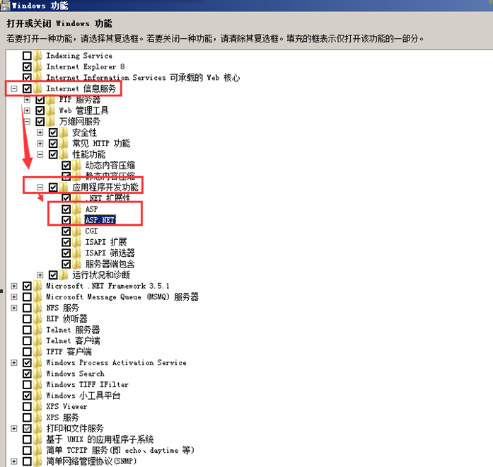 第四步:在服務中選擇“Asp.net服務”以及“Asp”服務。如圖: