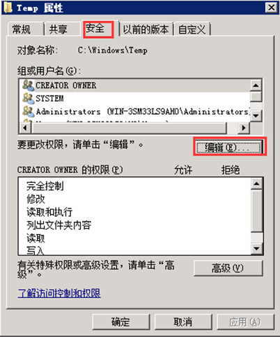 第二步,在彈出的對話框中點擊“安全”,并點擊“編輯”,輸入對象名為“Everyone”。如圖: