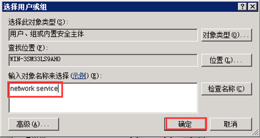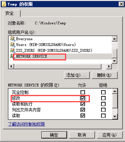 第五步,同樣的方法添加對象名“network service”并開放“修改”權限。如圖: