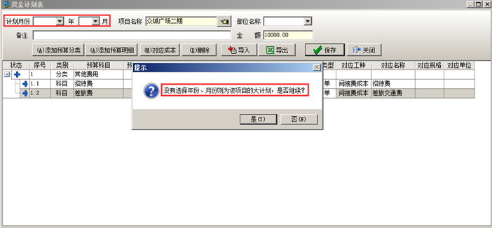 在工程管理軟件的資金計劃單中若選擇計劃月份,則資金計劃表為本項目當月的資金計劃,若不填月份,則資金計劃表默認為本項目的總的預算,工程管理軟件會給出相應的提示。如圖: