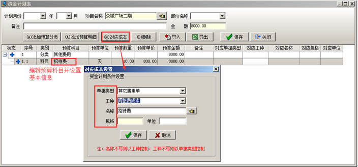 (2)在分類下面添加詳細的“預算明細”,此時要給預算明細設置“對應成本”,在“對應成本設置的對話框”設置資金計劃條件,選擇“單據類型”、“工種”以及“規格”,