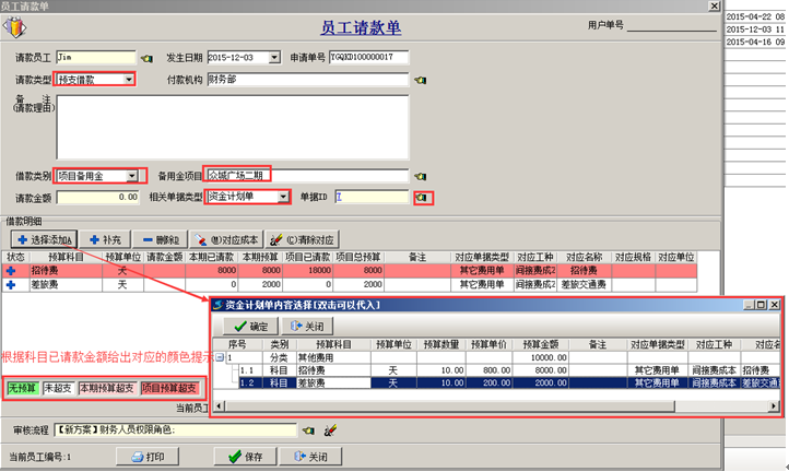 注:預算明細添加到請款單中,則系統會自動計算當前項目在對應預算科目下的已借款金額,對比資金計劃單中的預算金額,以不同的顏色提示用戶是否超支(本期預算超支或項目預算超支)。如圖: