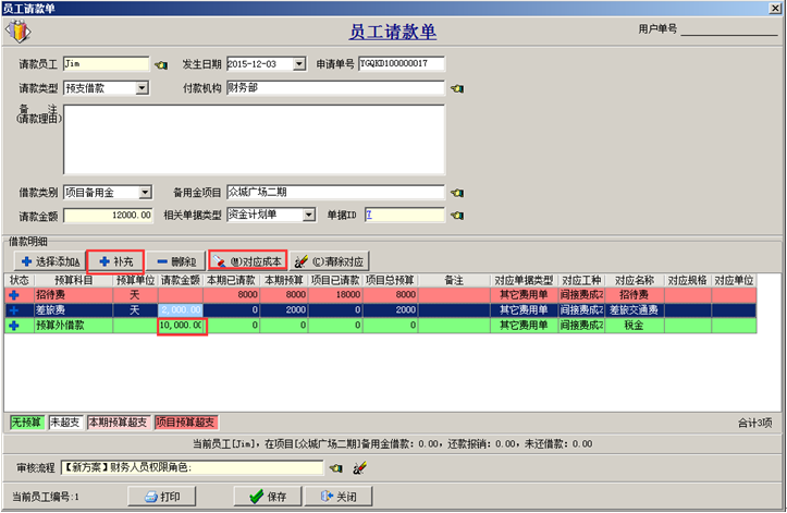 如果需要申請的預算科目在工程管理軟件的資金計劃單中沒有設置,可在“員工請款單中”進行補充,點擊“補充”按鈕,對應成本并輸入請款金額。在“員工請款單”申請項目備用金時。單據中補充的無預算的科目以“預算外借款”顯示顏色為綠色。如圖: