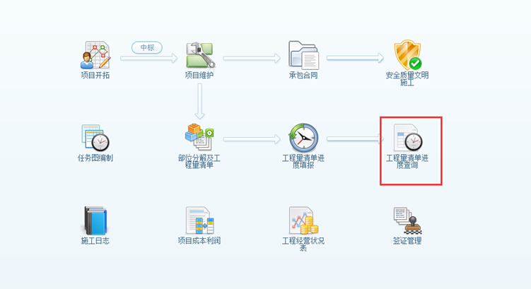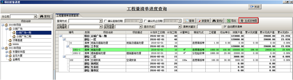 工程項(xiàng)目管理系統(tǒng)中進(jìn)行項(xiàng)目進(jìn)度查詢時(shí),系統(tǒng)會(huì)根據(jù)項(xiàng)目部分以及工程量清單匯總項(xiàng)目進(jìn)度。如圖: