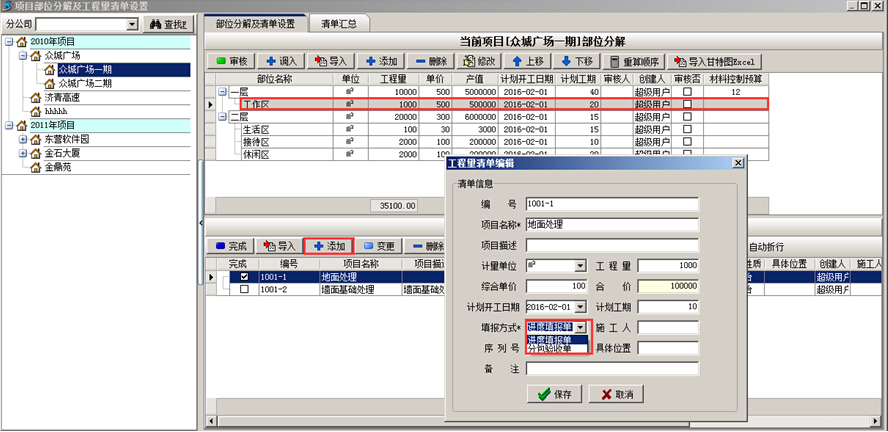 工程項(xiàng)目管理系統(tǒng)中部位分解完成之后,對(duì)項(xiàng)目做工程量清單設(shè)置。首先選中項(xiàng)目部位,然后在“工程量清單”里面點(diǎn)擊“添加”添加工程量清單,在編輯工程量清單時(shí),填寫各項(xiàng)基本信息。如圖: