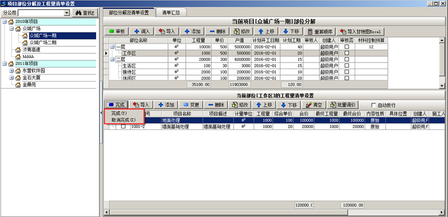 (3)、在工程量清單中直接執(zhí)行“完成”,如圖所示: