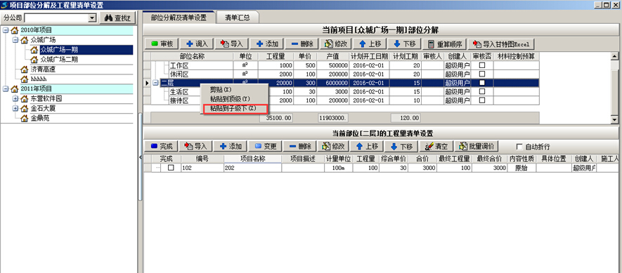 工程項(xiàng)目管理系統(tǒng)中已維護(hù)好的項(xiàng)目部位可進(jìn)行剪切粘貼的操作。“剪切”時(shí)選中要變動(dòng)的部位,點(diǎn)擊鼠標(biāo)右鍵選擇“剪切”,“粘貼”時(shí)選中項(xiàng)目部位,點(diǎn)擊鼠標(biāo)右鍵,選擇“粘貼到頂級(jí)下”或“粘貼到子級(jí)下”,如圖: