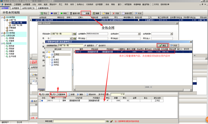 (1)選中對(duì)應(yīng)的分包合同點(diǎn)擊“新建”按鈕,把工程量清單導(dǎo)入合同中。如圖: