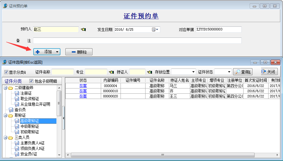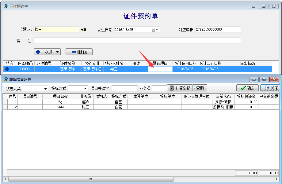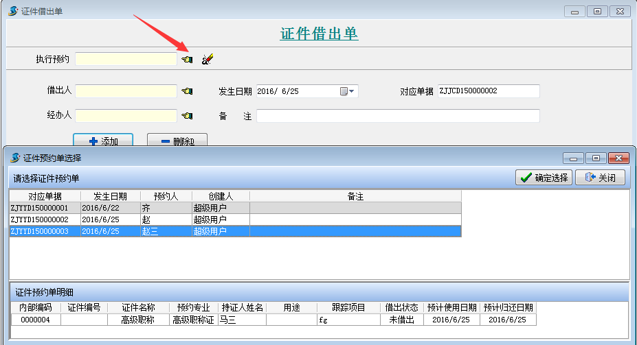 證件借出單可以選擇執(zhí)行我們上一步所演示的預(yù)約和需要跟蹤的項目