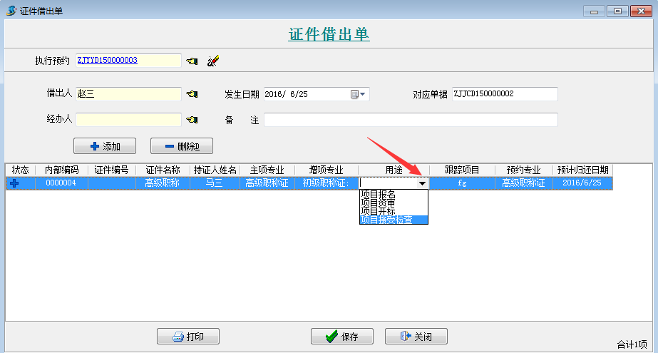 還可以選擇借出證件的用途“項目報名”、“項目資審”、“項目開標(biāo)”、“項目接受檢查”