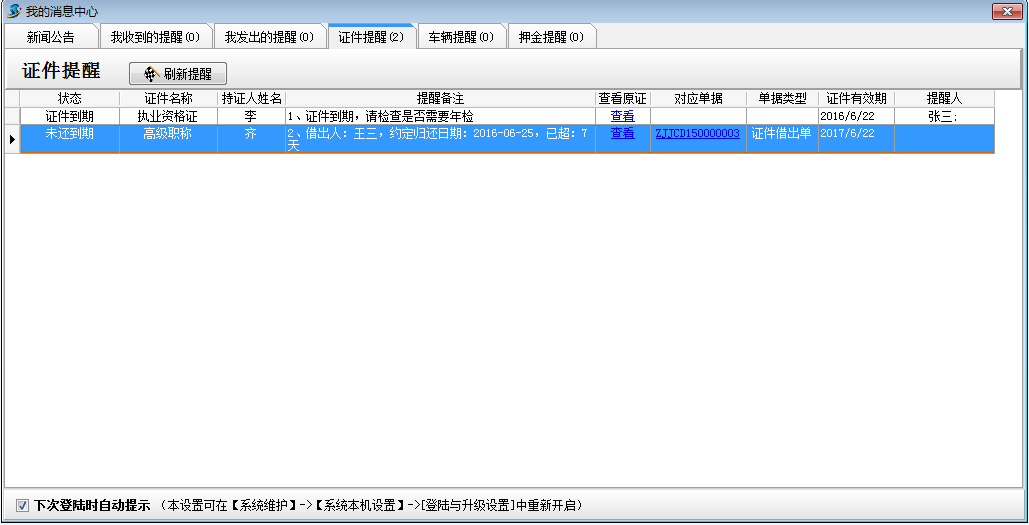 添加提醒人和提前提醒天數(shù)后,證件到期需要年檢或到期未還,提醒人會收到軟件的提醒信息,點下圖中藍(lán)色字體可以“查看原證”和“對應(yīng)單據(jù)”