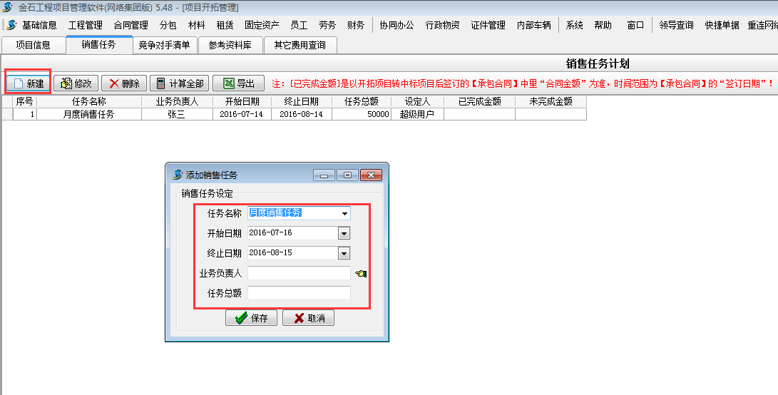 首先在施工項(xiàng)目管理軟件【項(xiàng)目開拓】-【銷售任務(wù)】處新建銷售任務(wù)計(jì)劃。如下圖: