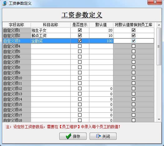 填寫科目名稱和默認(rèn)值,是否顯示打勾,是否將默認(rèn)值替換到員工庫
